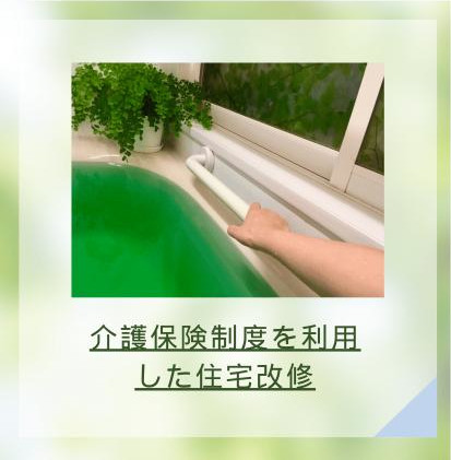 介護保険適用の住宅改修工事としましては必要箇所への手すりの取付、居室・浴室・トイレなどの扉の変更、床材の変更、段差の解消、和式便器から洋式便器への取り替え、ユニットバス交換、スロープ設置、ロードヒーティング工事、外階段のスリップ防止マット設置とそれに付随する工事などを承っております。
